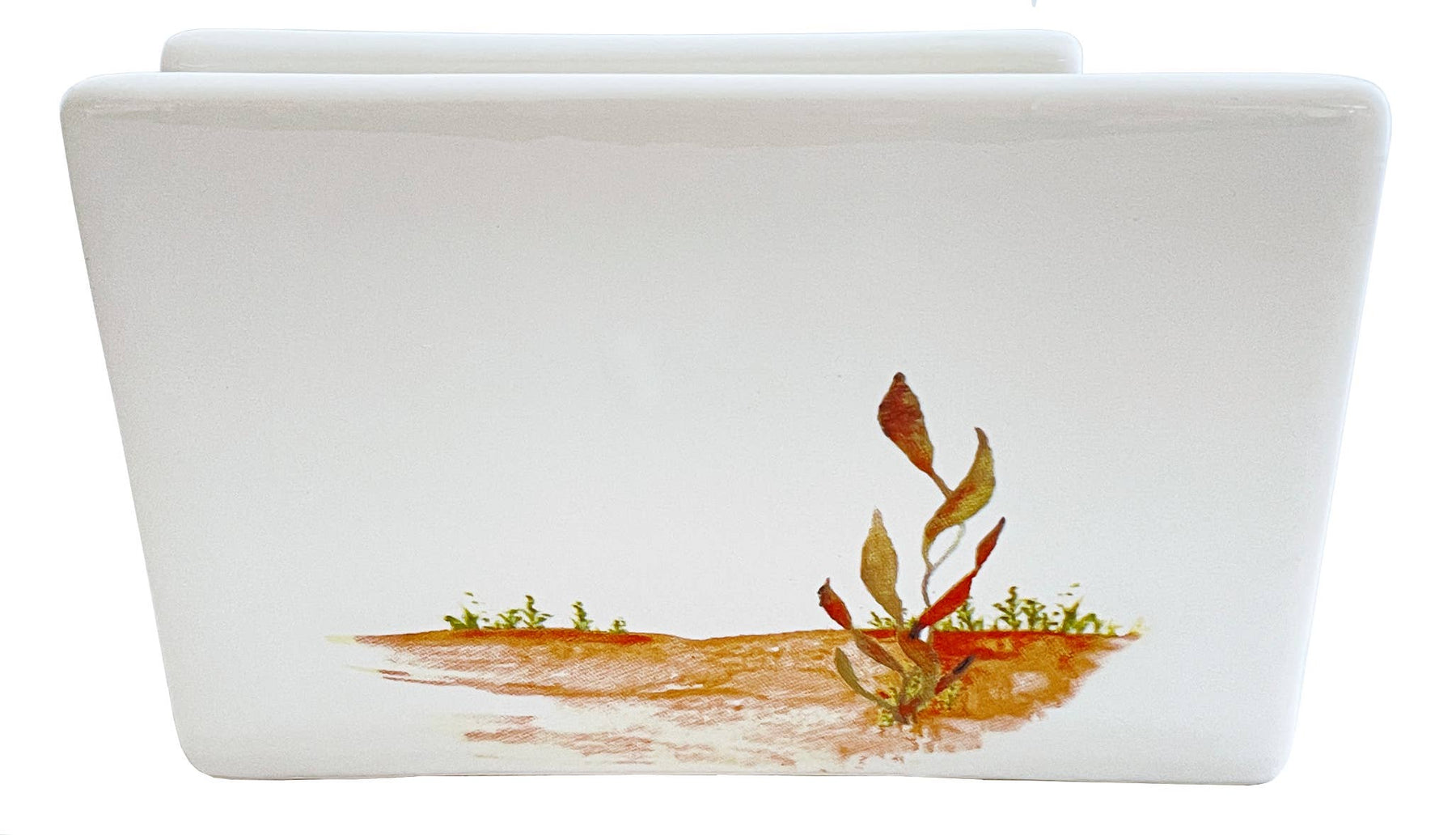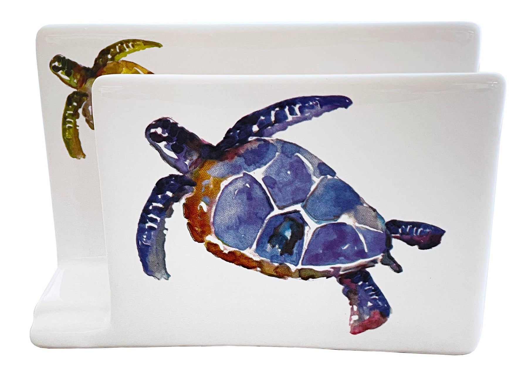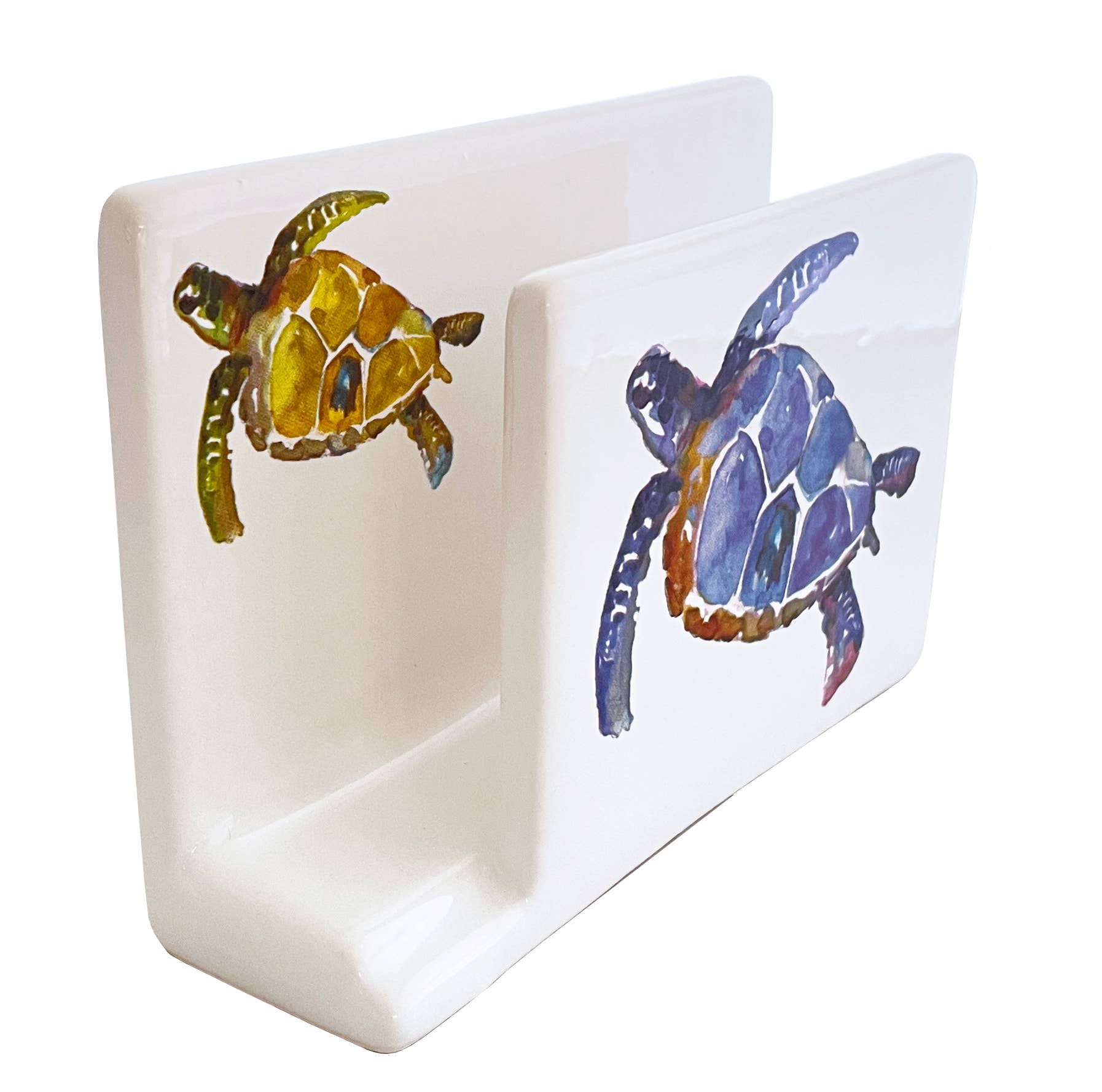 Hand painted and decorated napkin holder/folder holder featuring a water color of turtles swimming. Measurements are 4.5"h, 6.25"w,2"d. This ceramic item is made entirely in Italy for Abbiamo Tutto. Great house warming gift.