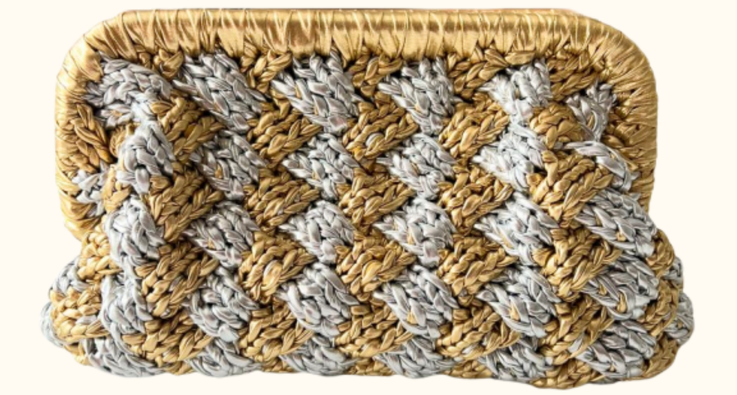 Description:•Crochet metallic clutch bag• Shoulder chain