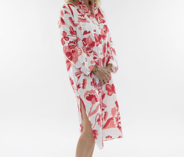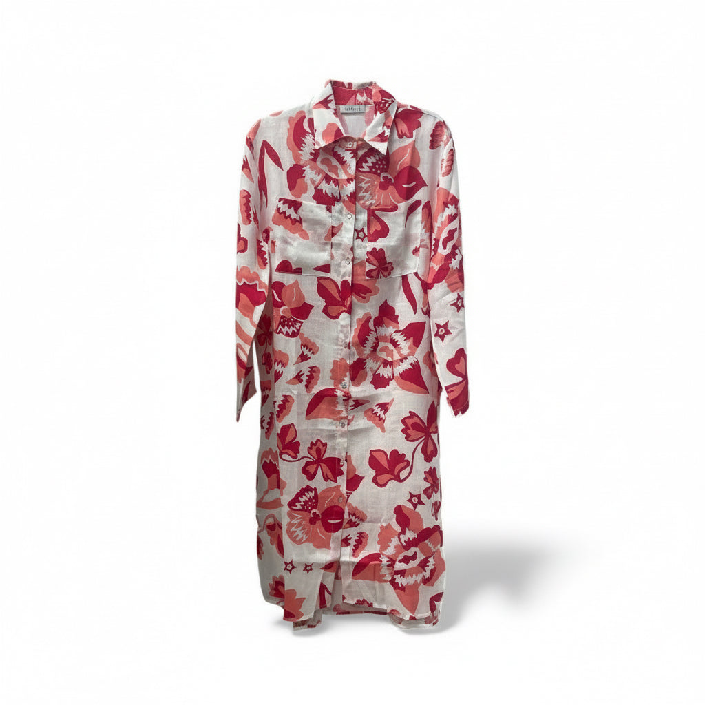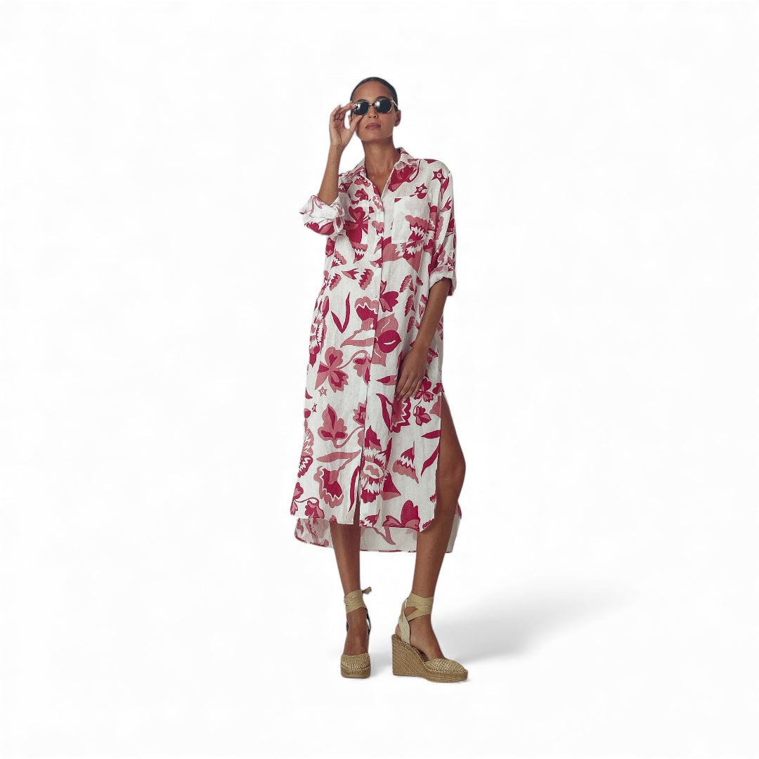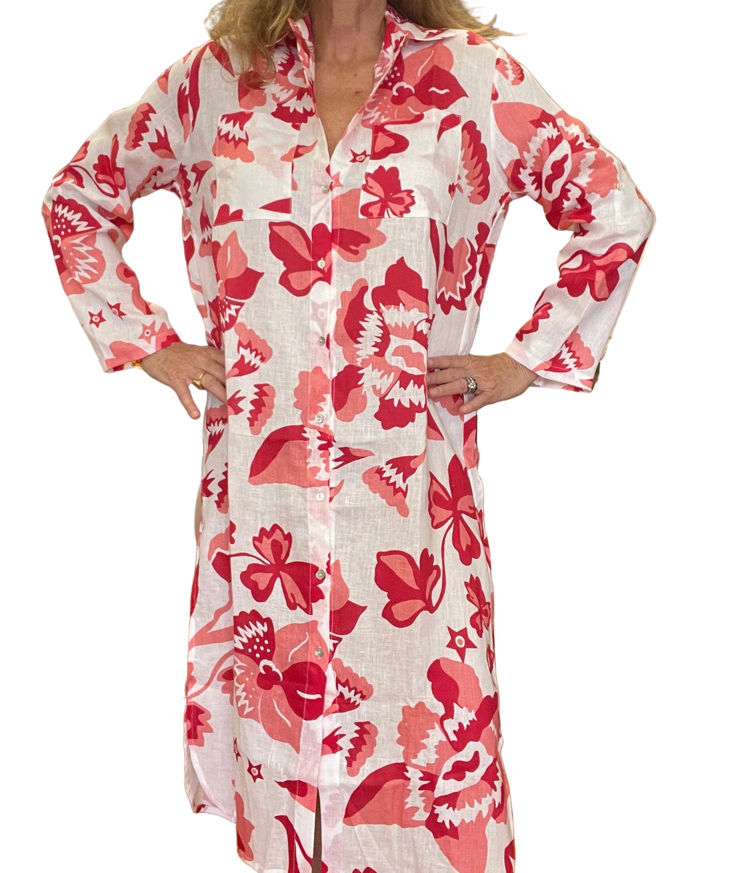 Multi pink colored linen dress. Midi length with slits on each side. Sleeves can roll up with button attachment.