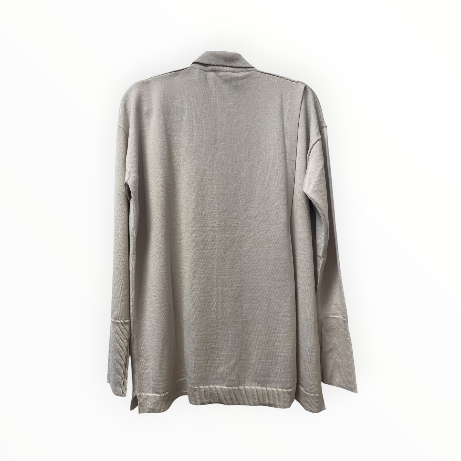 Super fine wool sweater with collar and button down. Open long flap on back right side of sweater