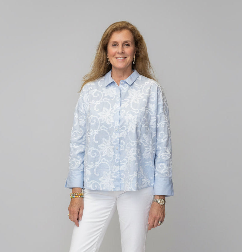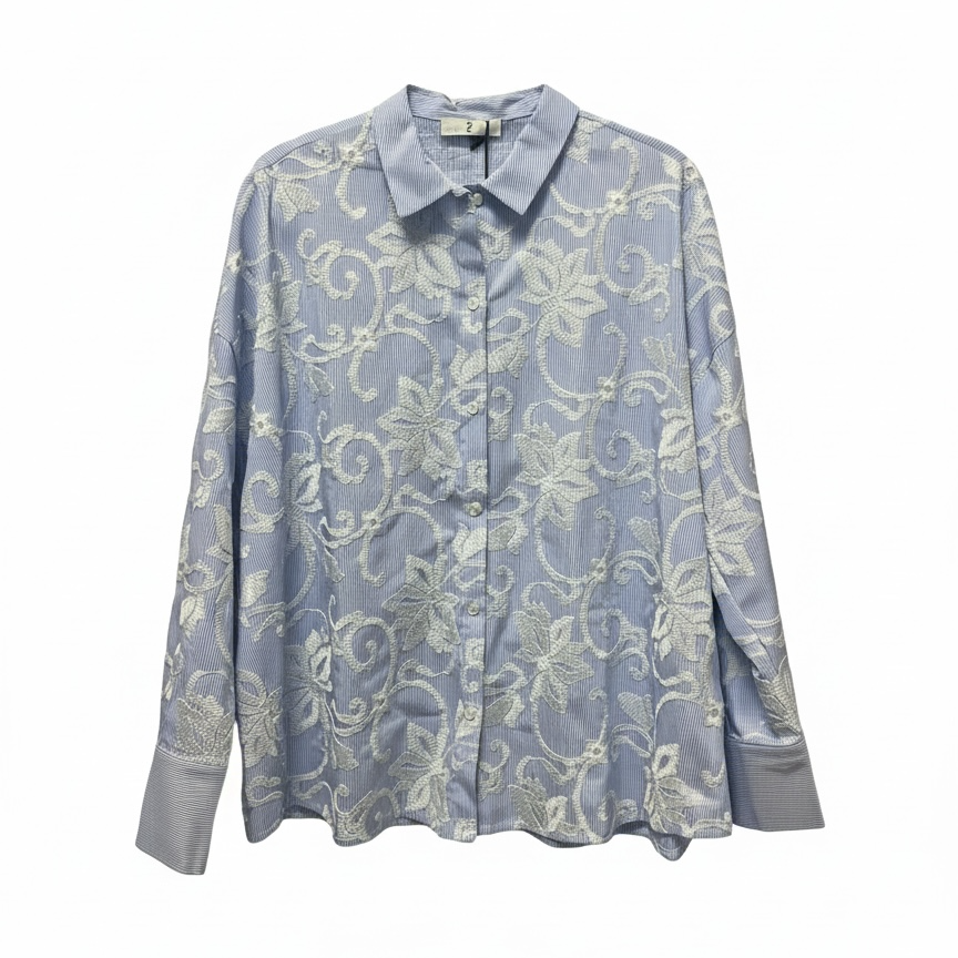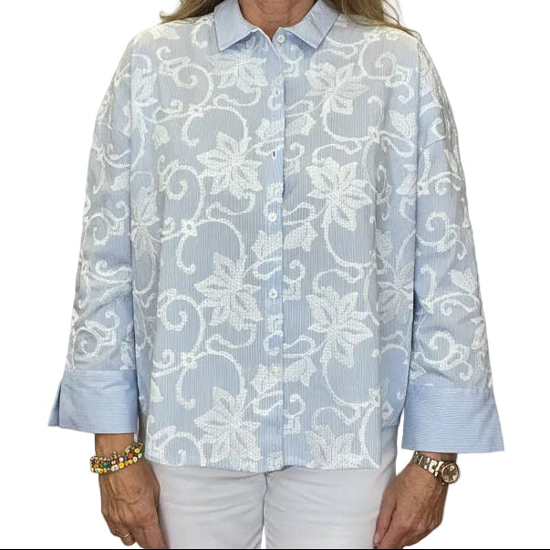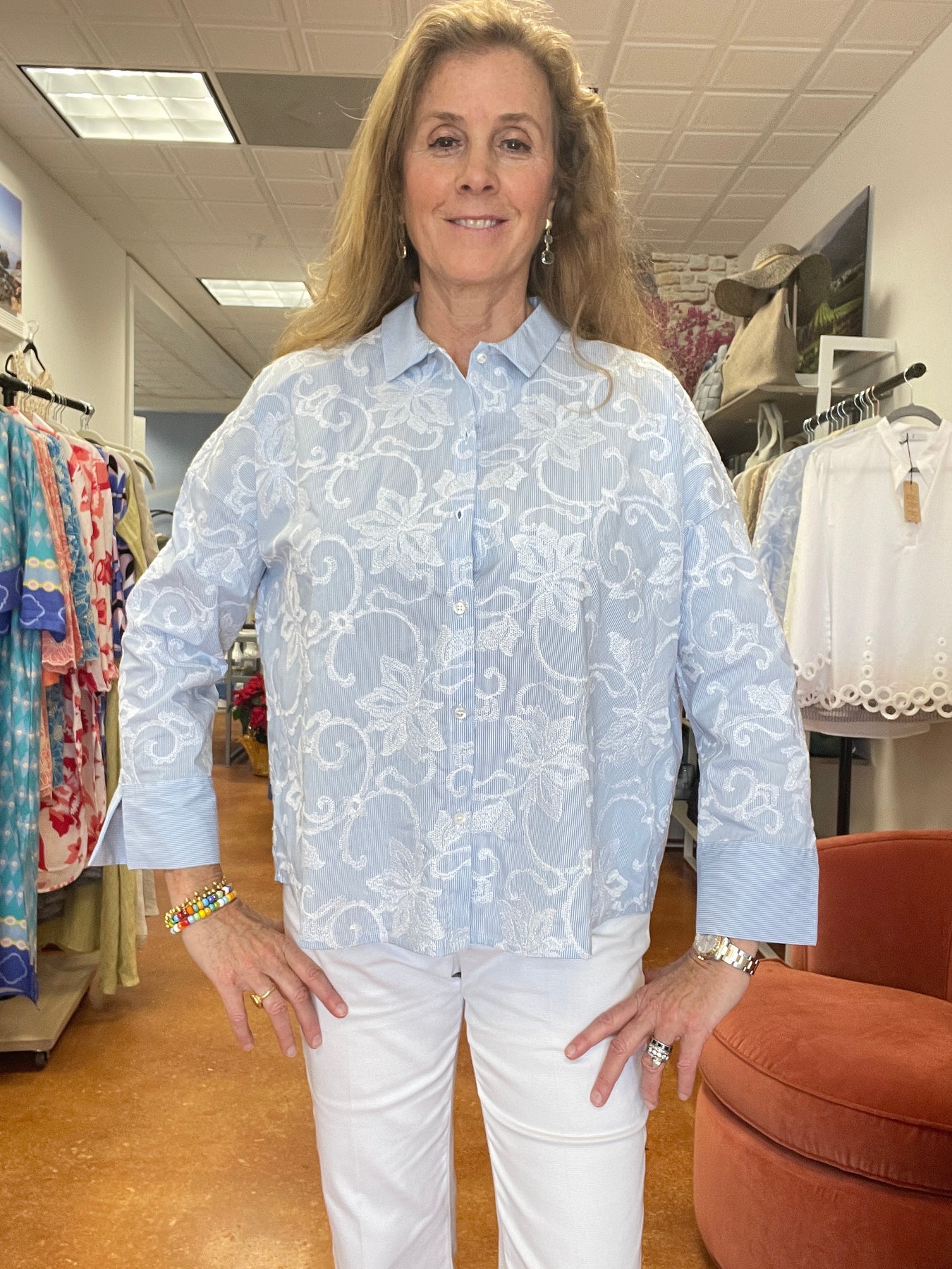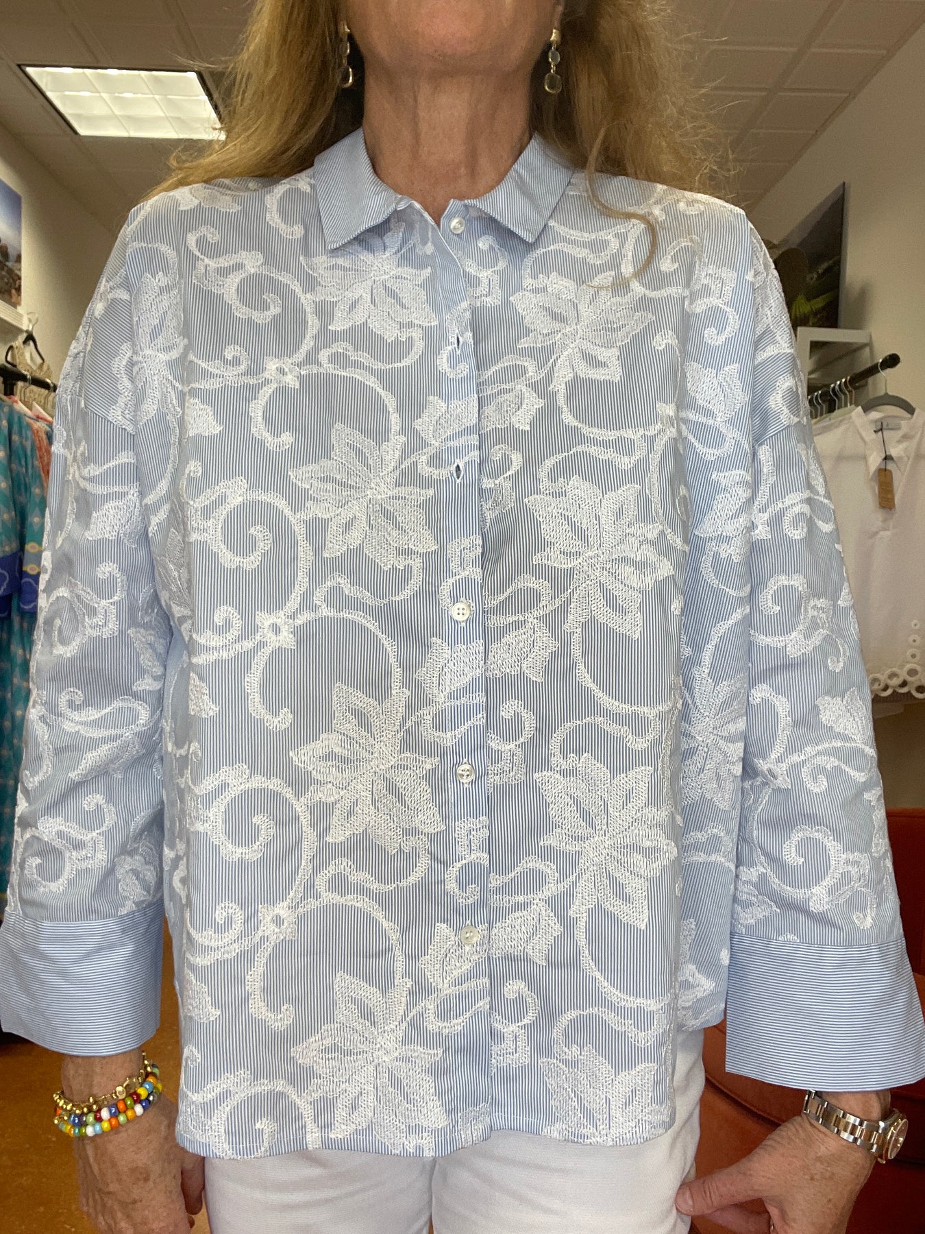 Light blue striped cotton blouse with beautiful white flowered embroidery throughout.