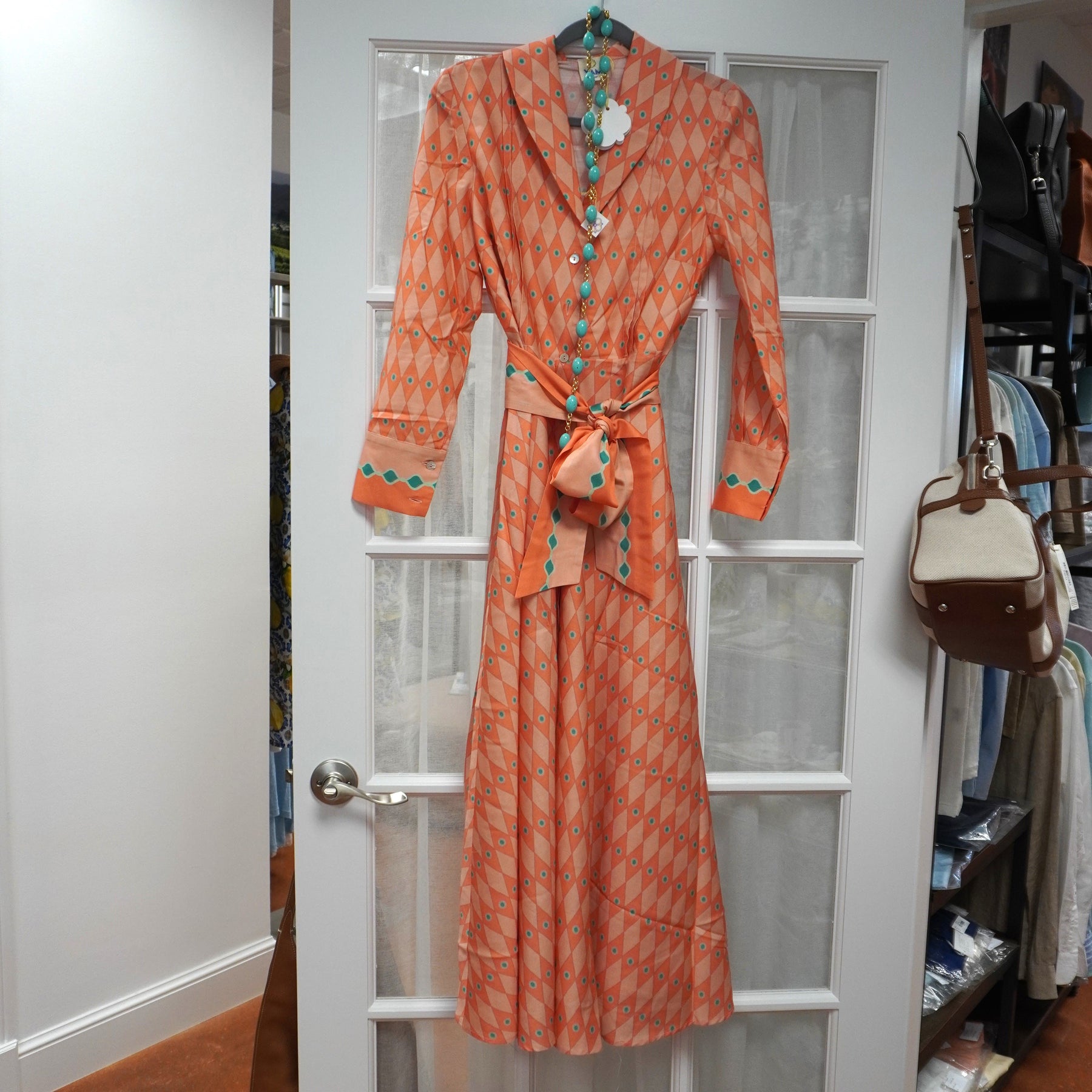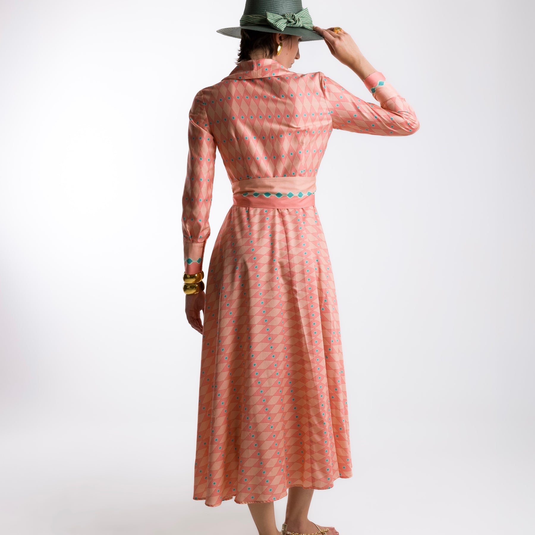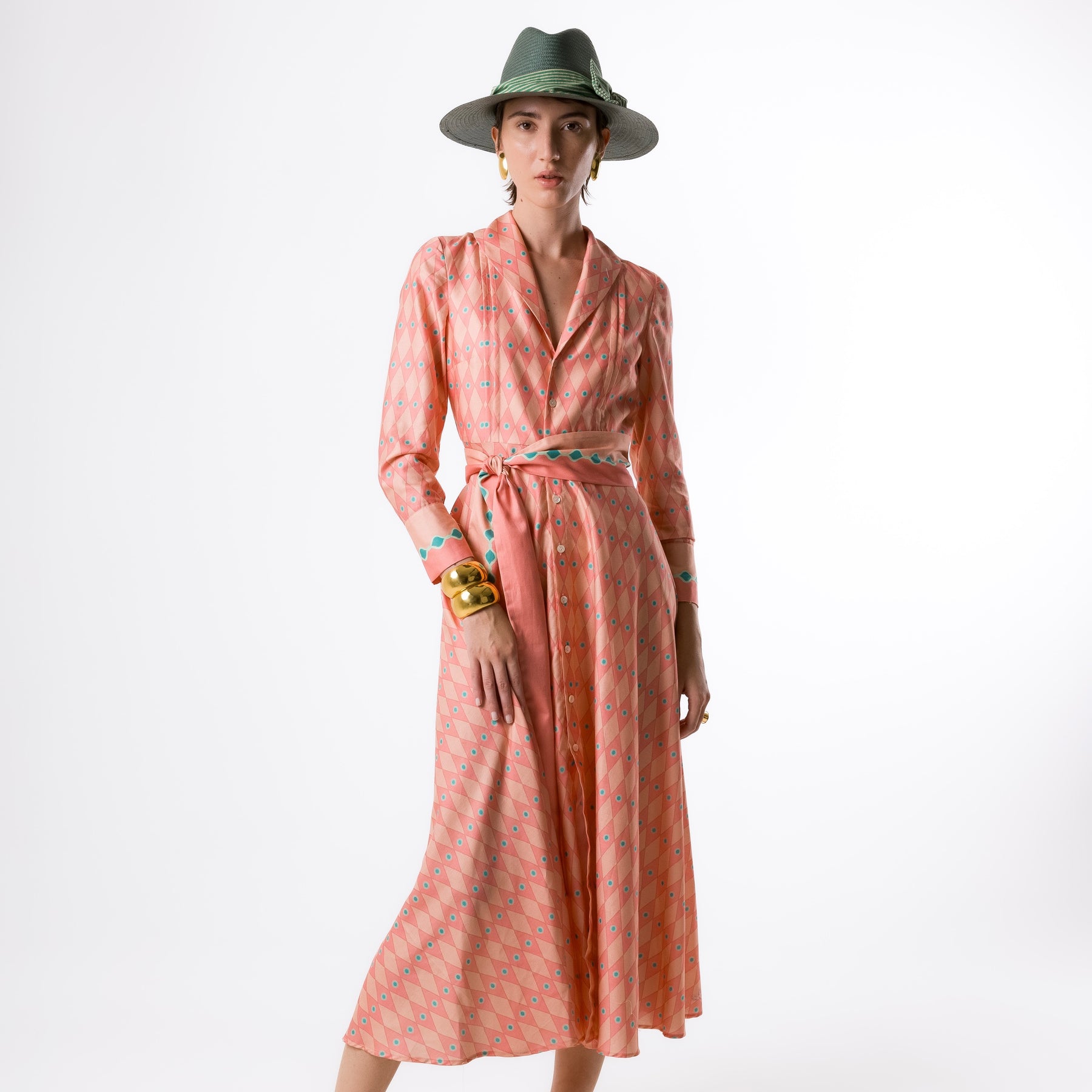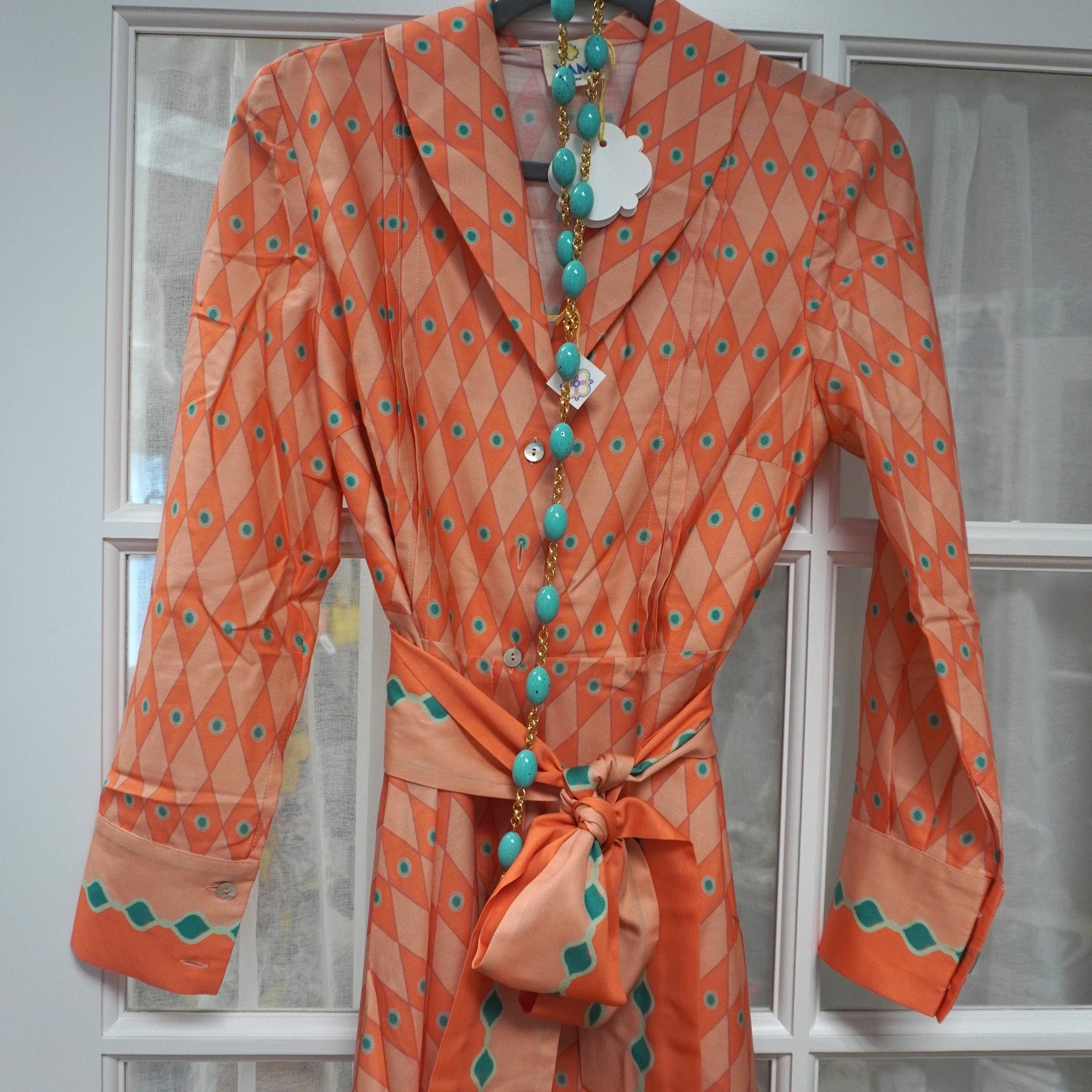 !00 % Cotton Button down with belt at waist Geometric pattern. Midi length
